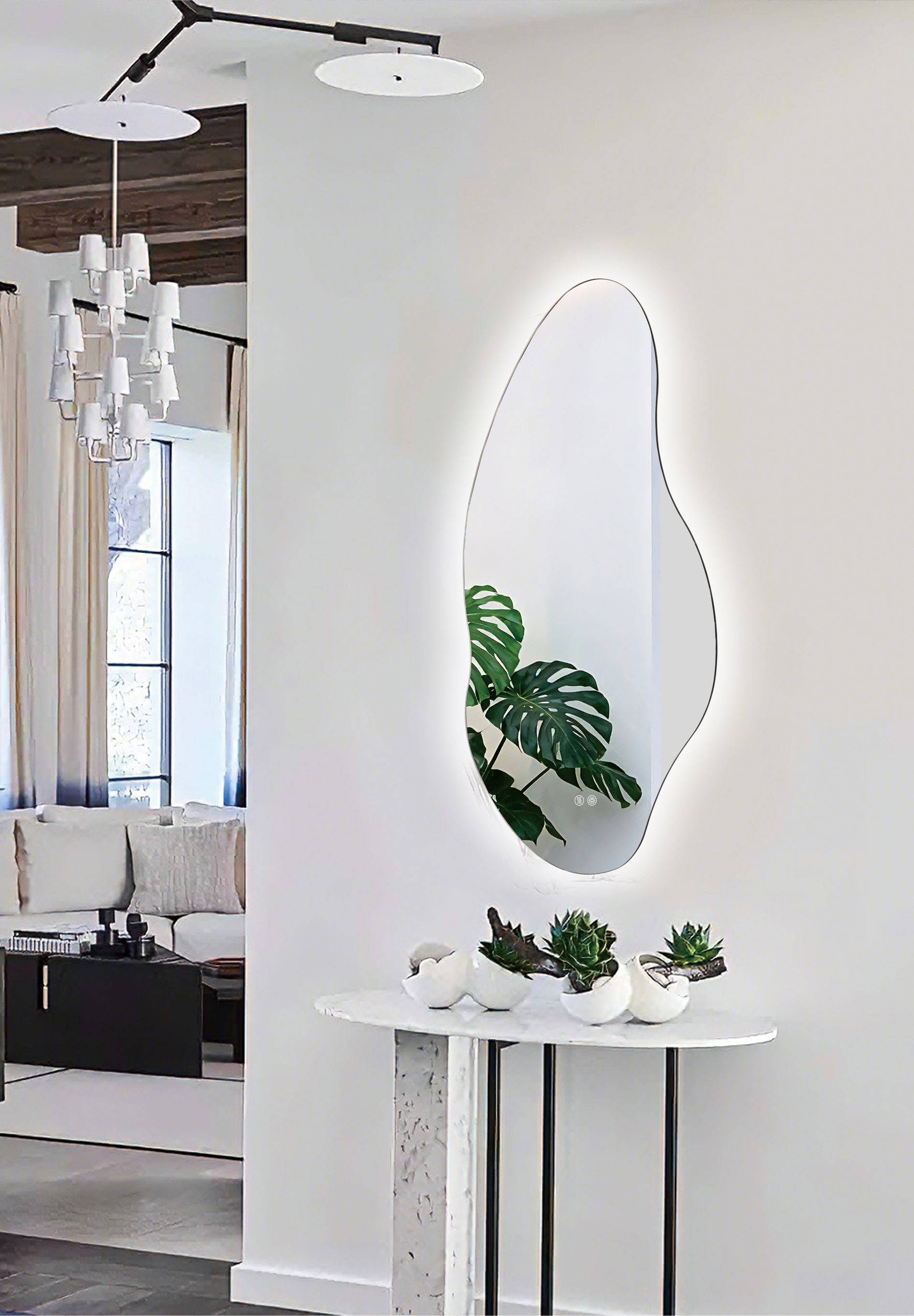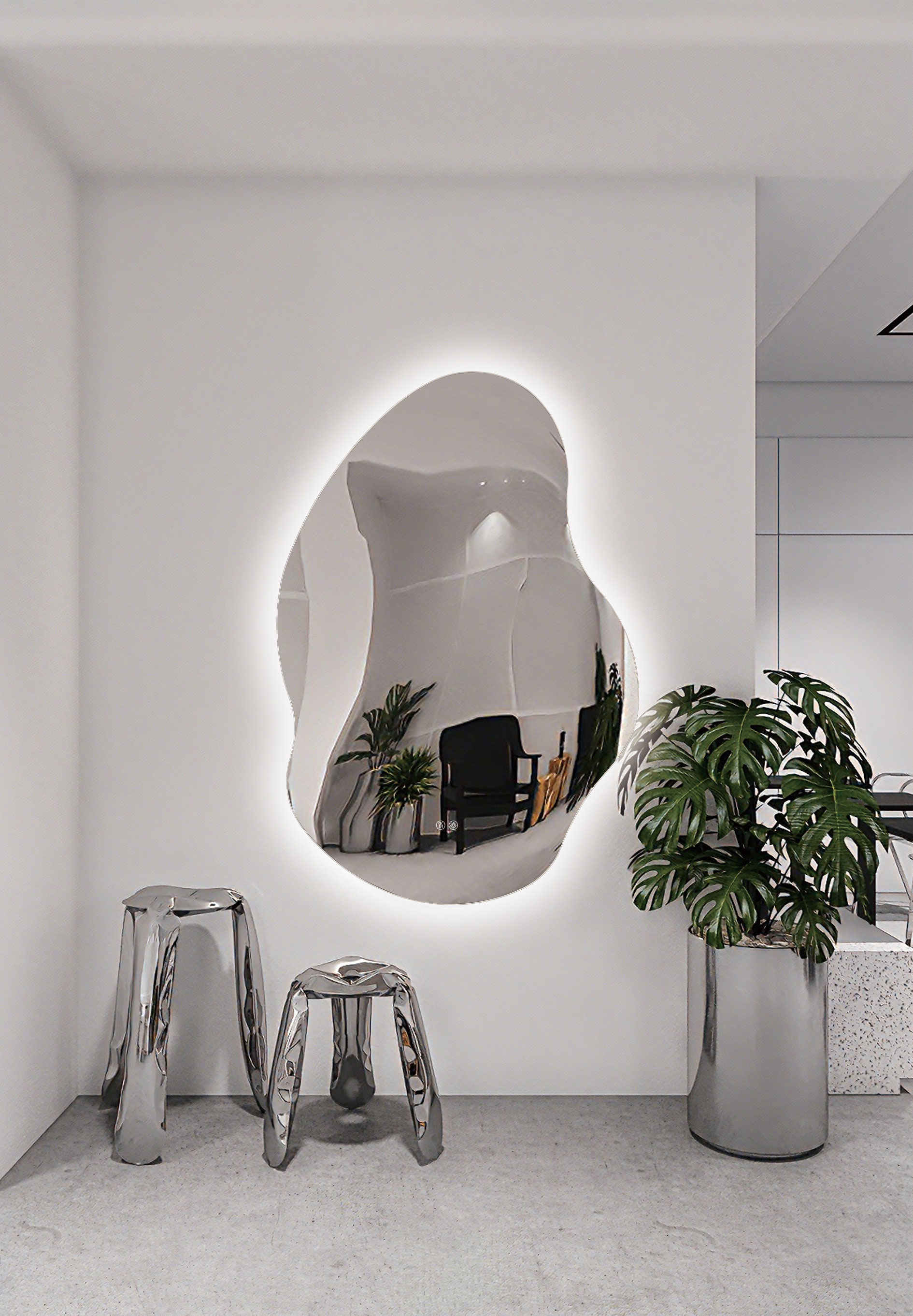 A subtle backlight traces its contour, releasing a calm halo into the space.