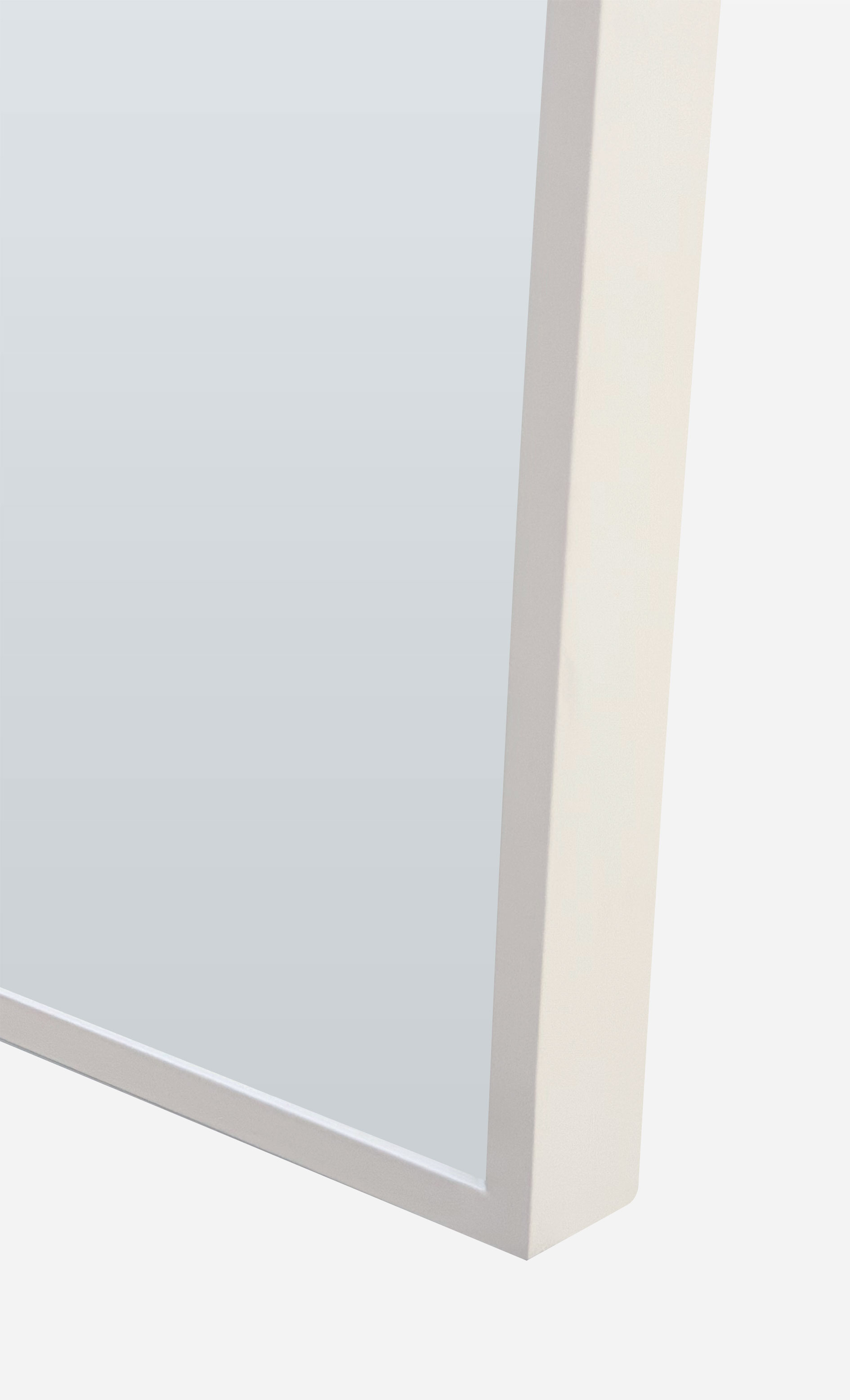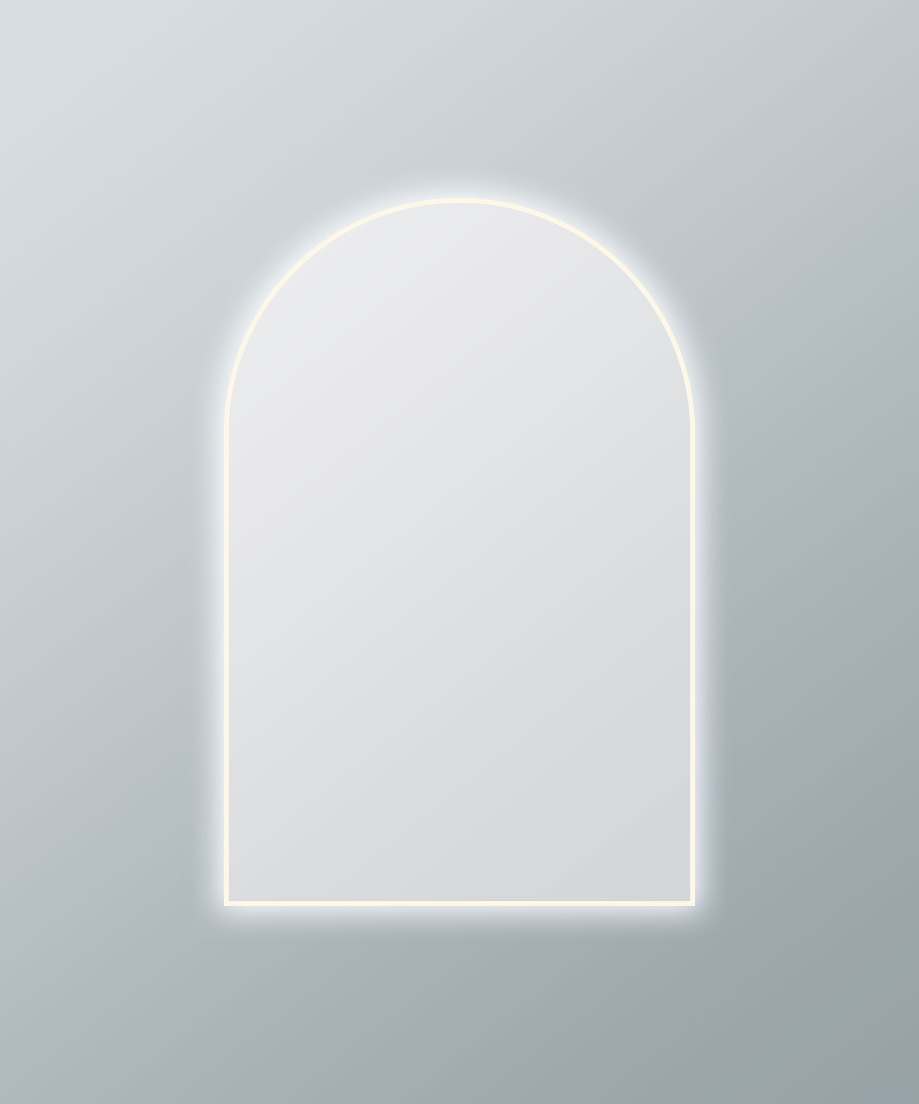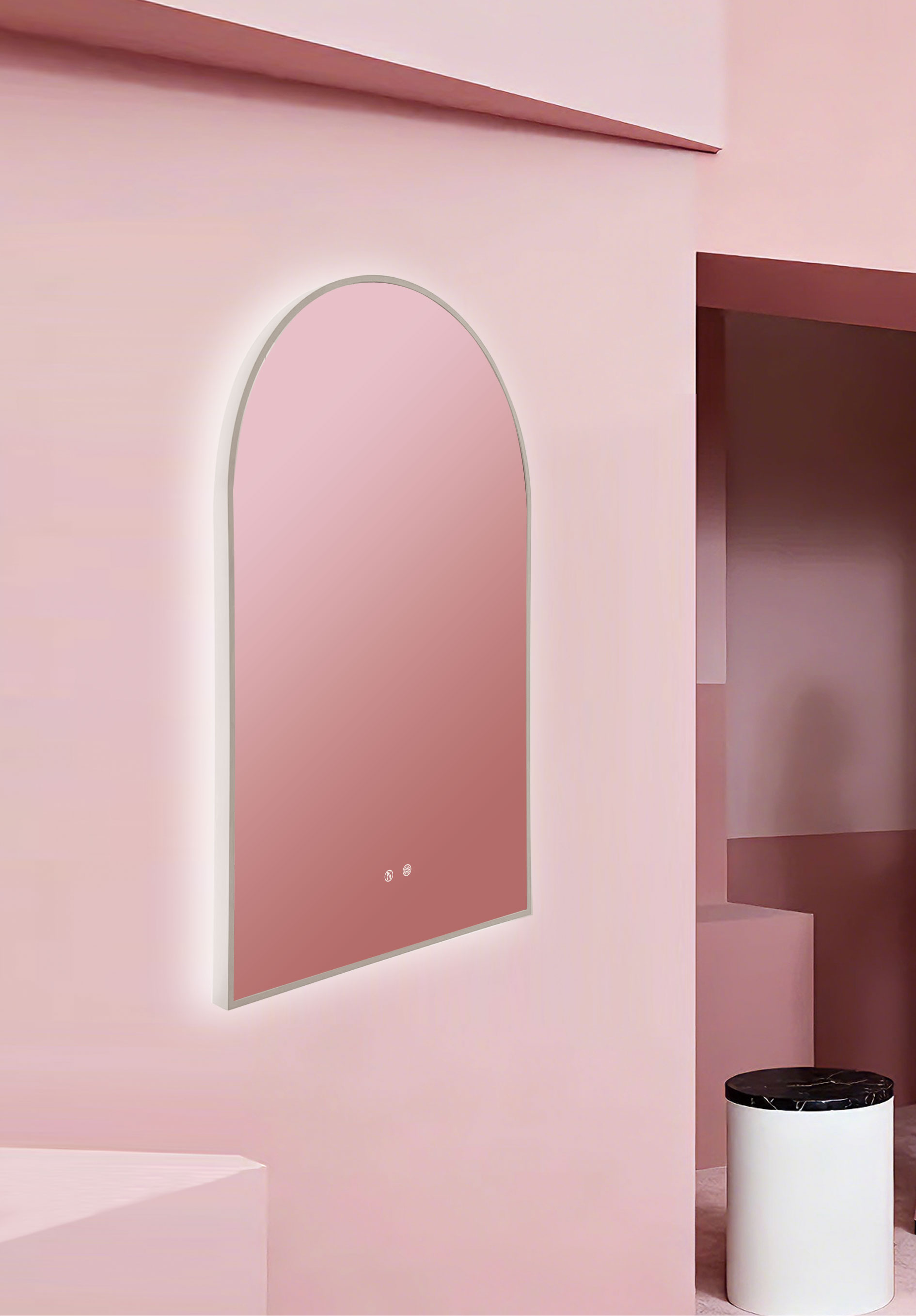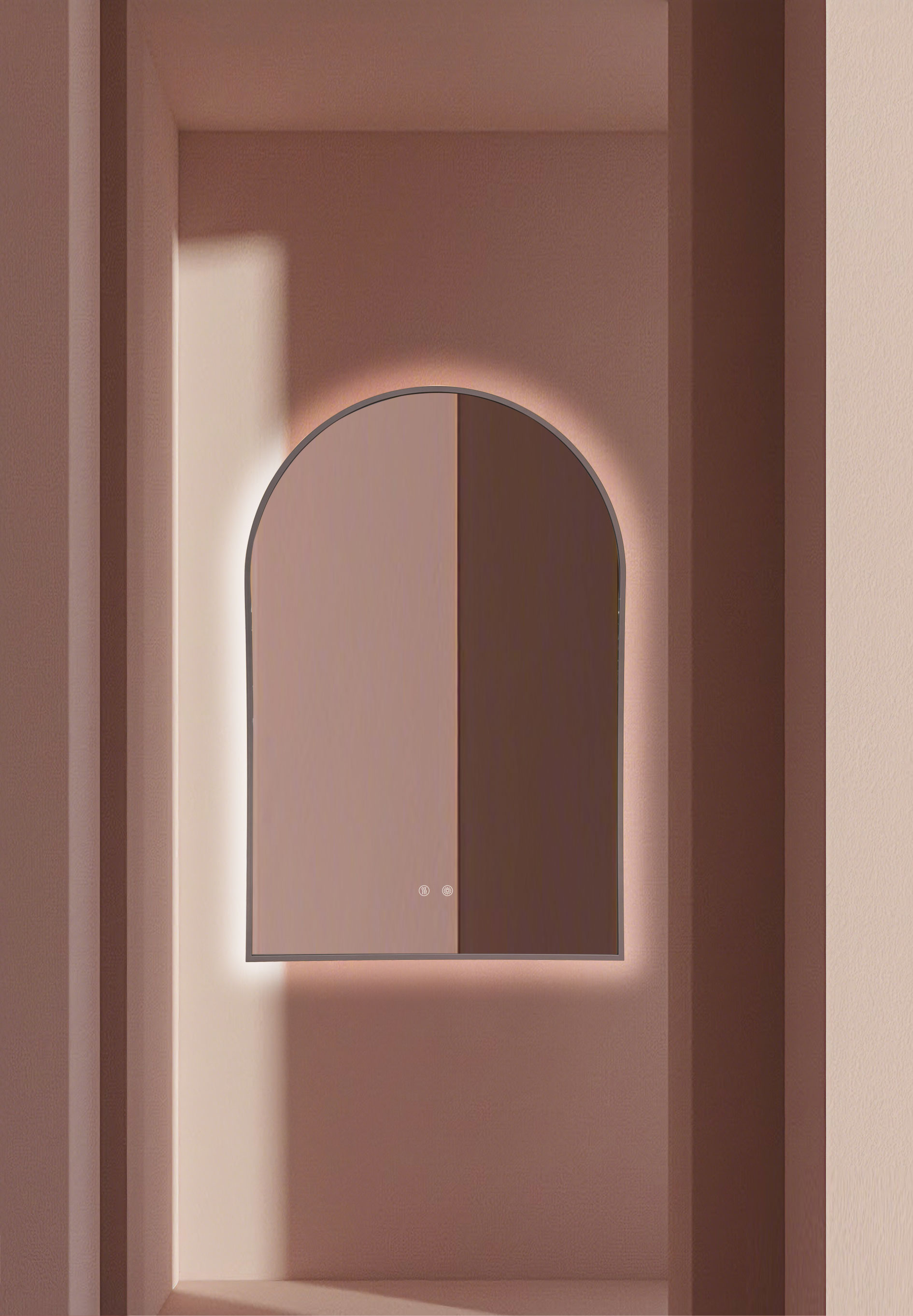 An arched mirror framed in seamless aluminum, its curve softened by a gentle halo of backlight.