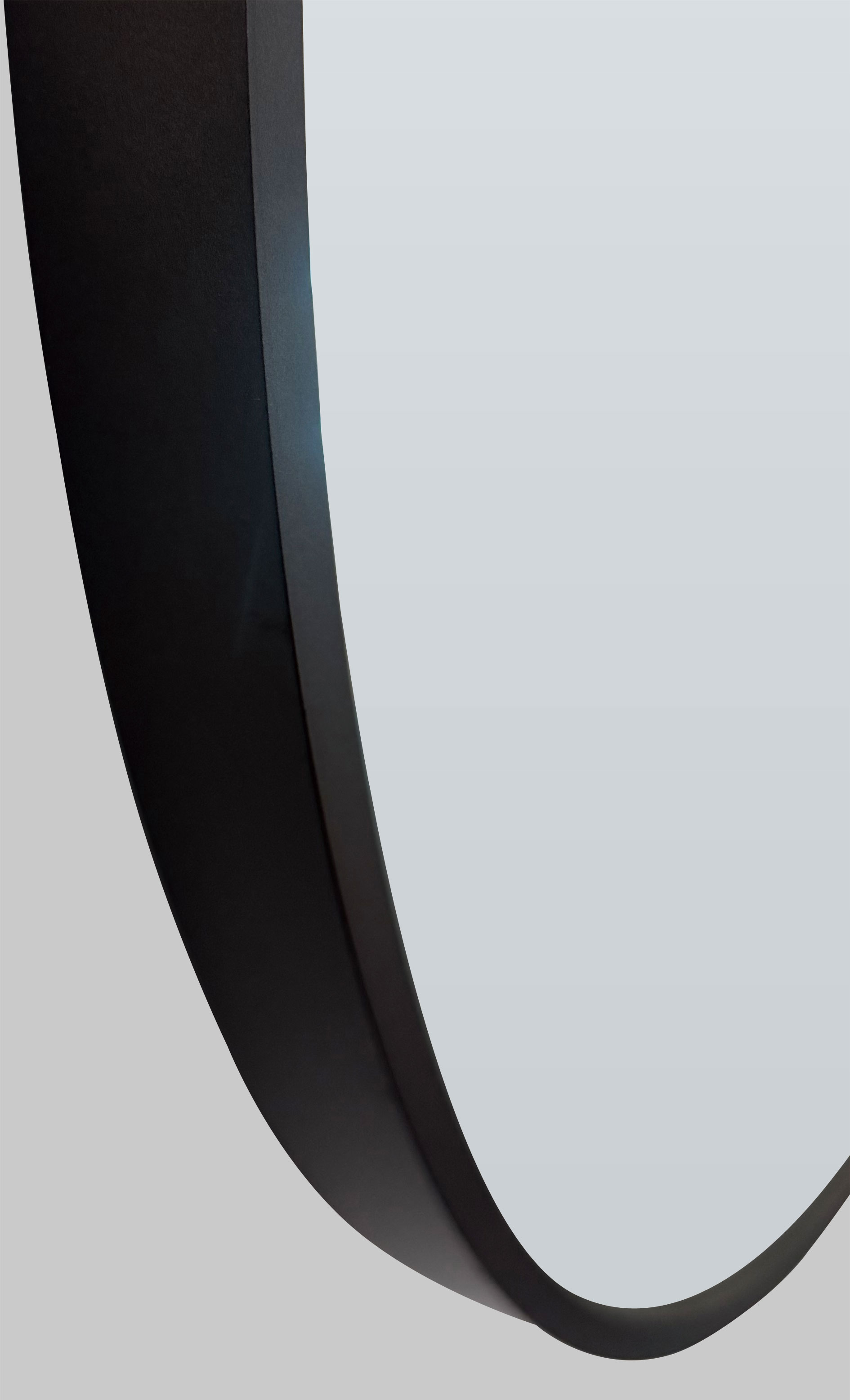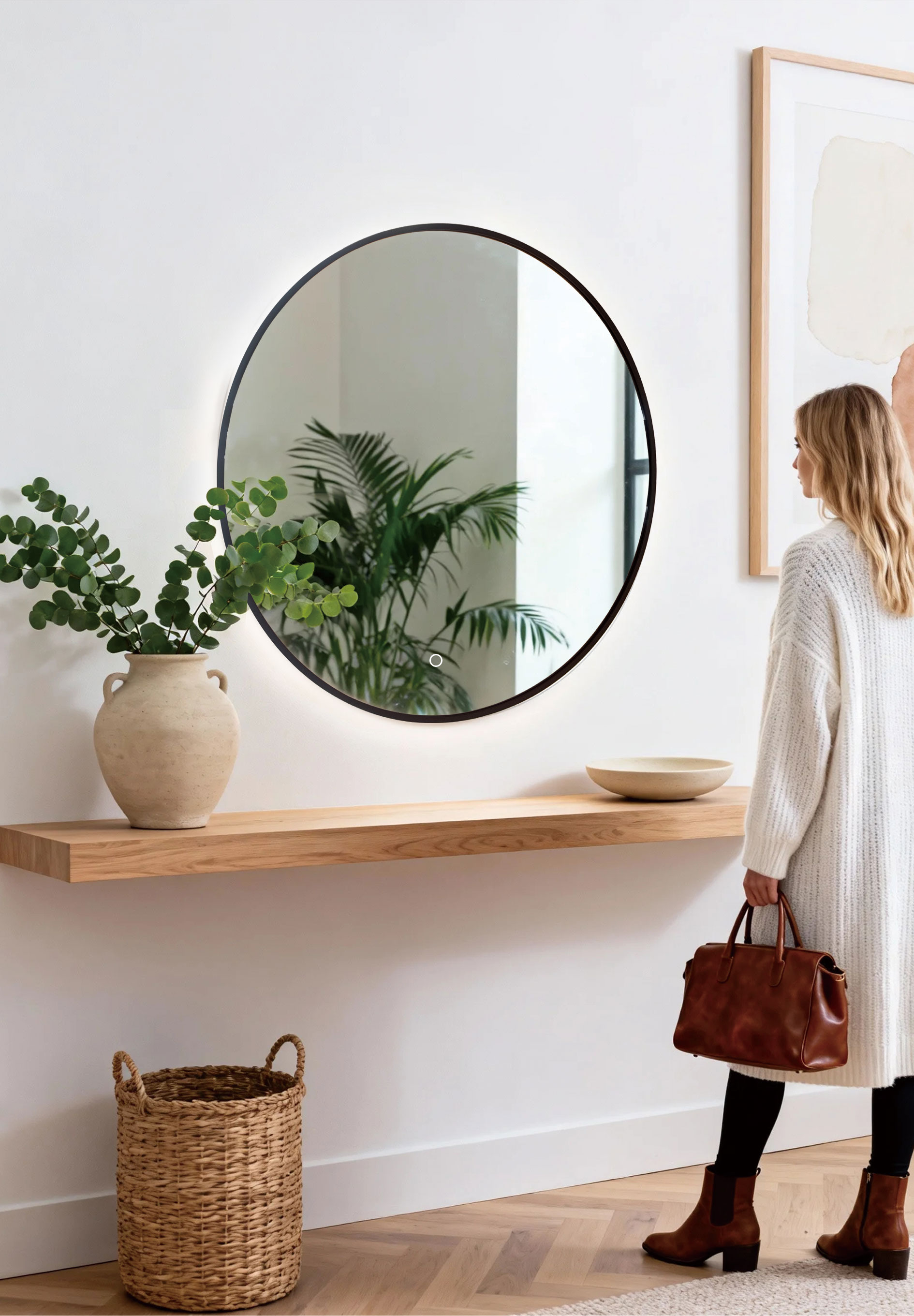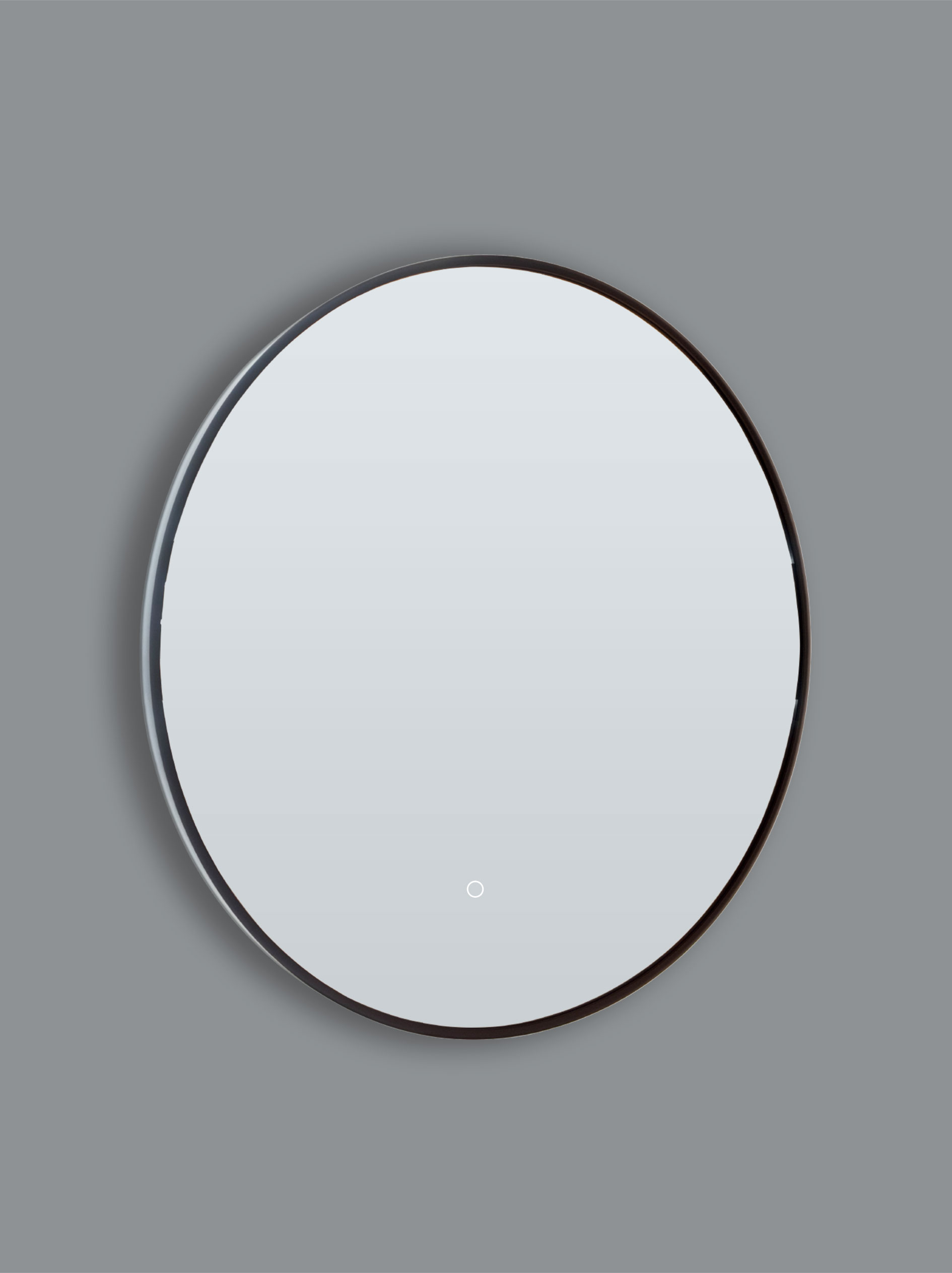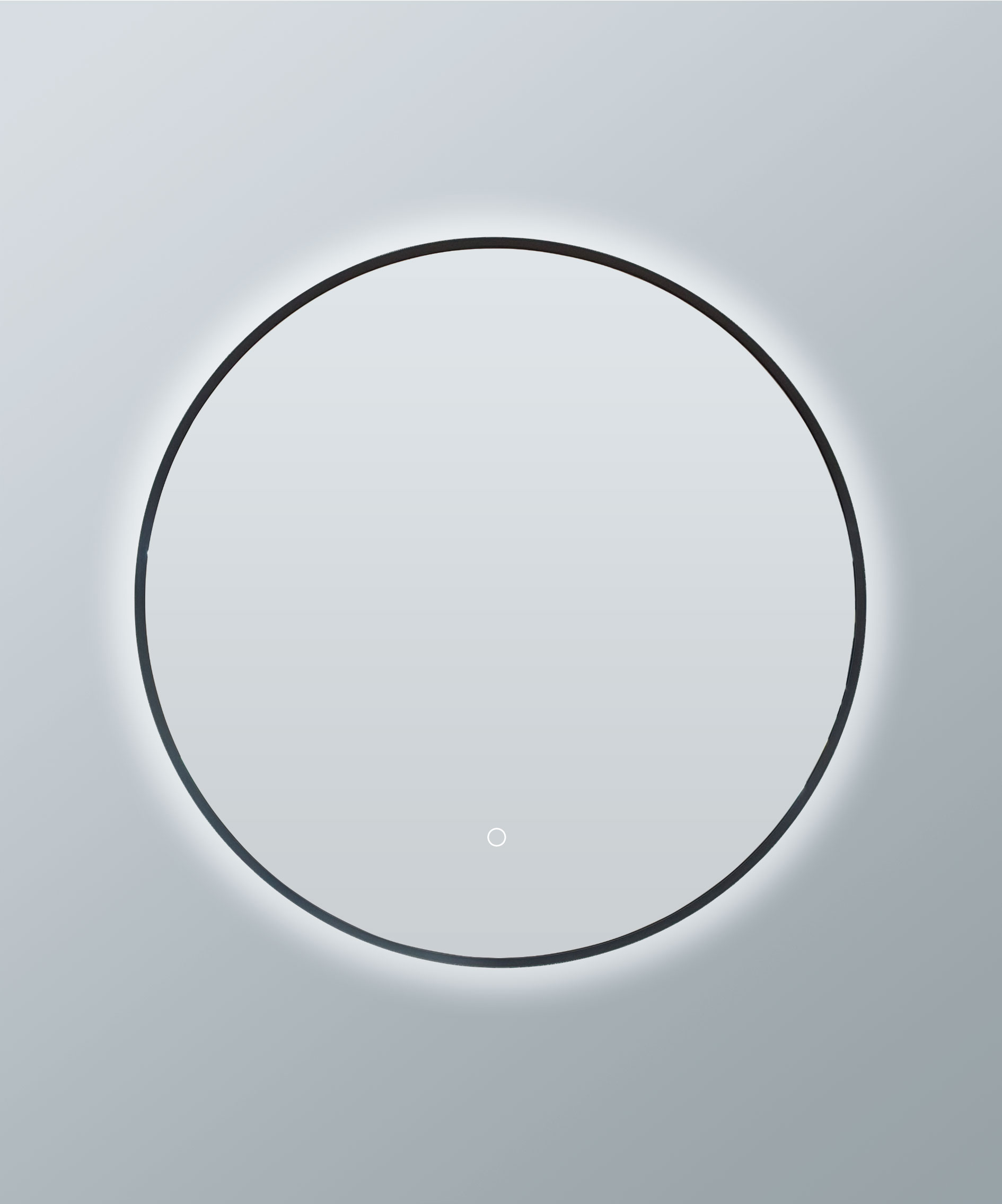 A circular mirror framed in seamless welded aluminum, defined by a quiet halo of backlight.