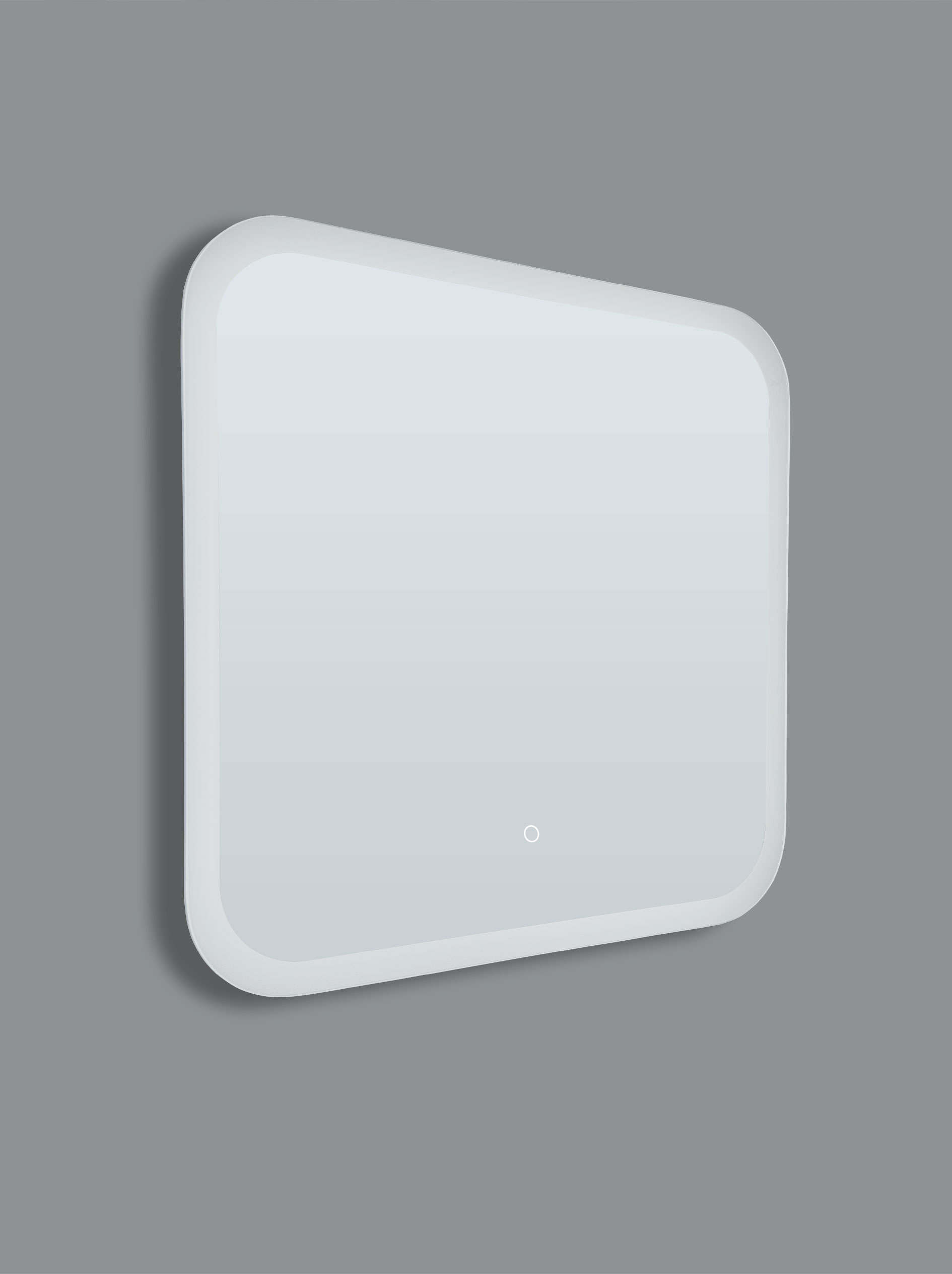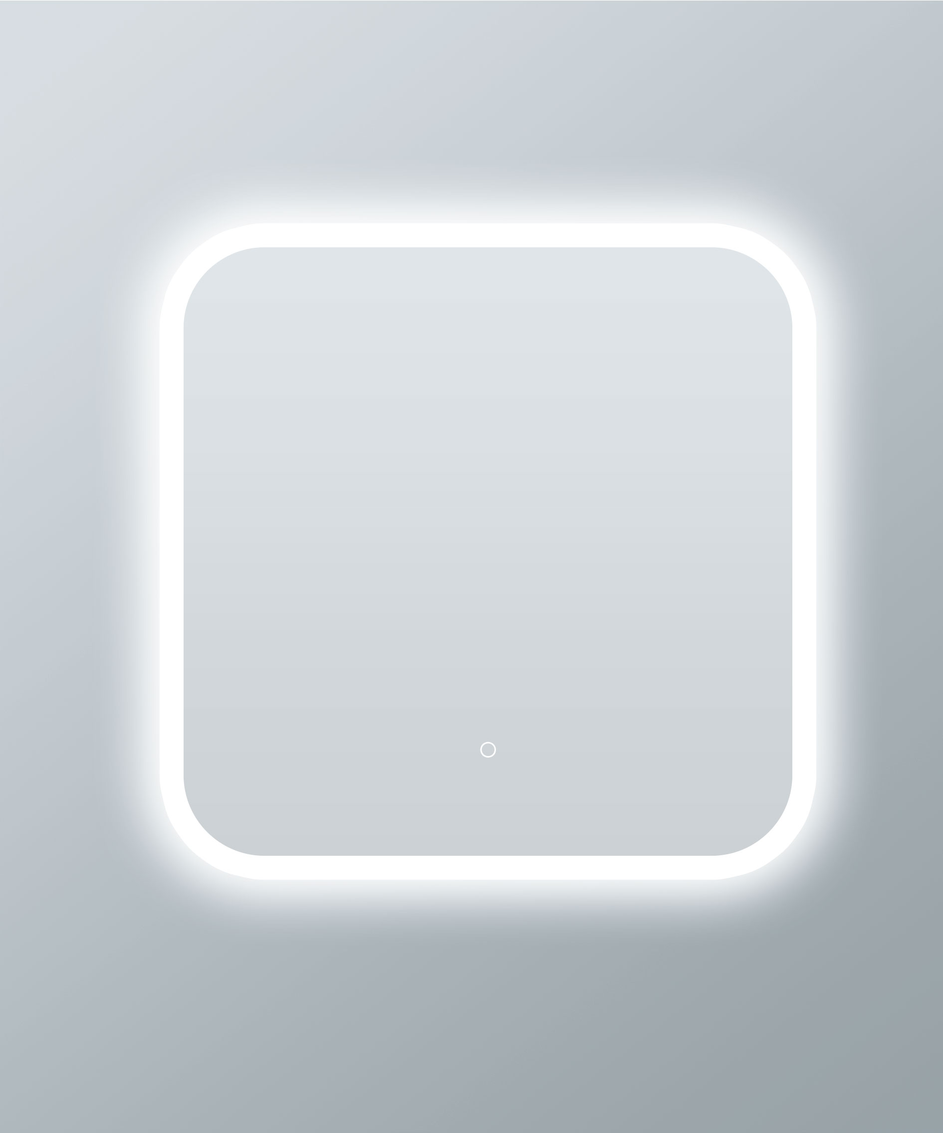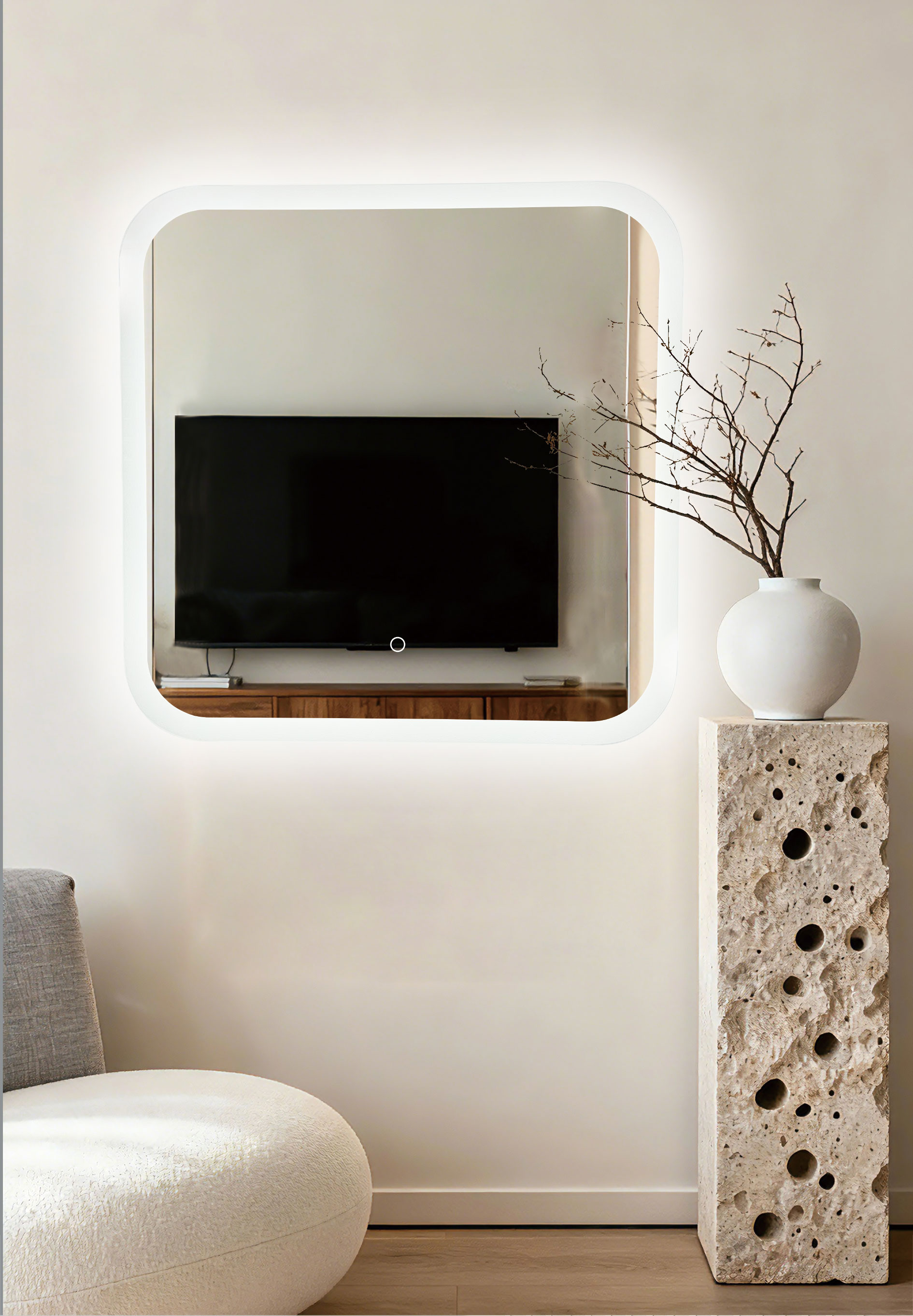 A softly squared mirror with gentle rounded corners, edged in clear glass that carries a quiet line of light.