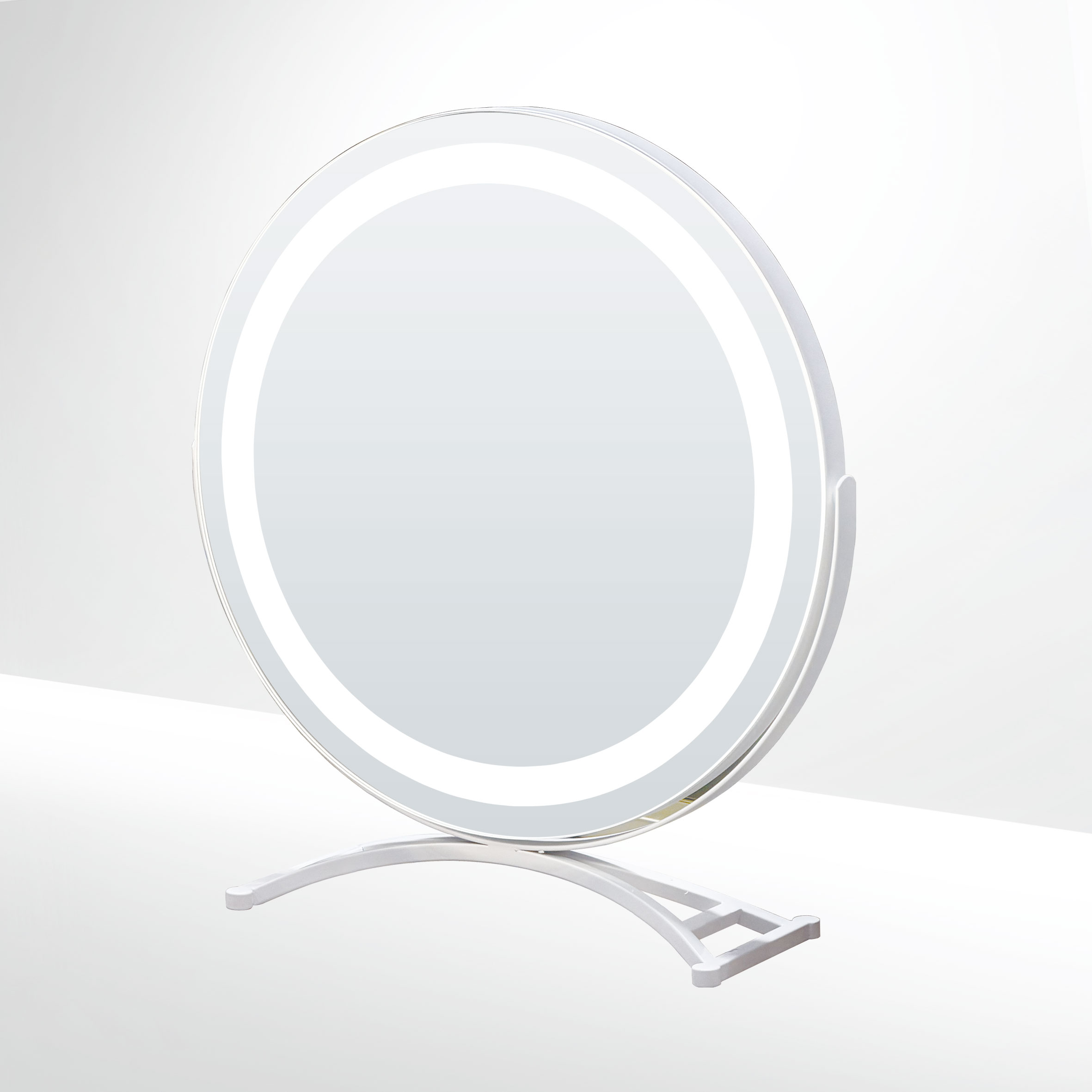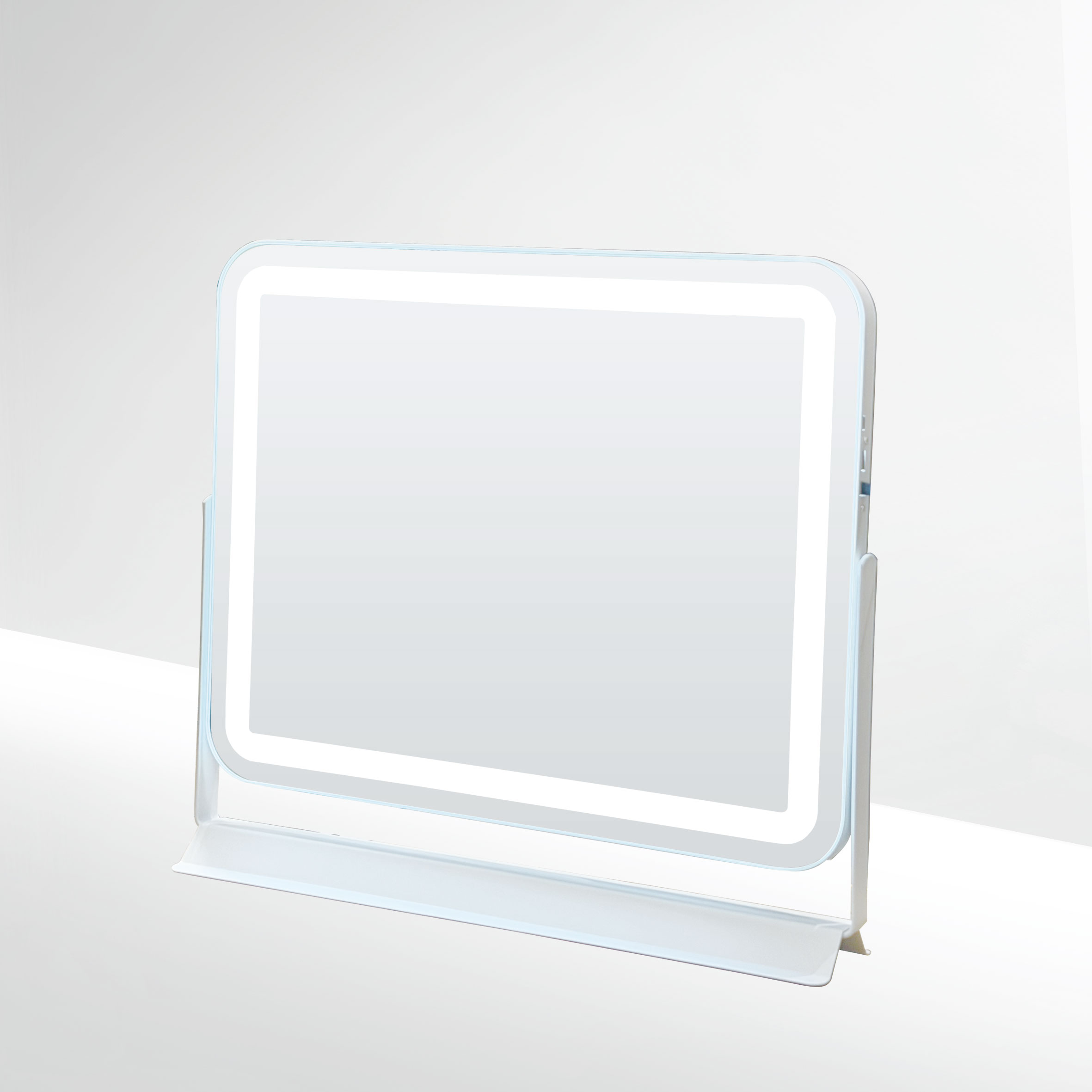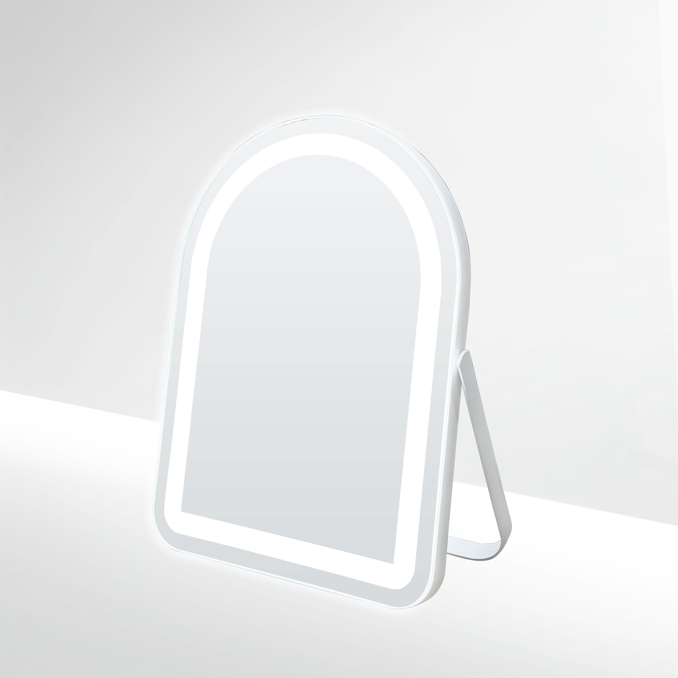 This tabletop mirror collection is defined by soft backlighting and clean, minimal forms.