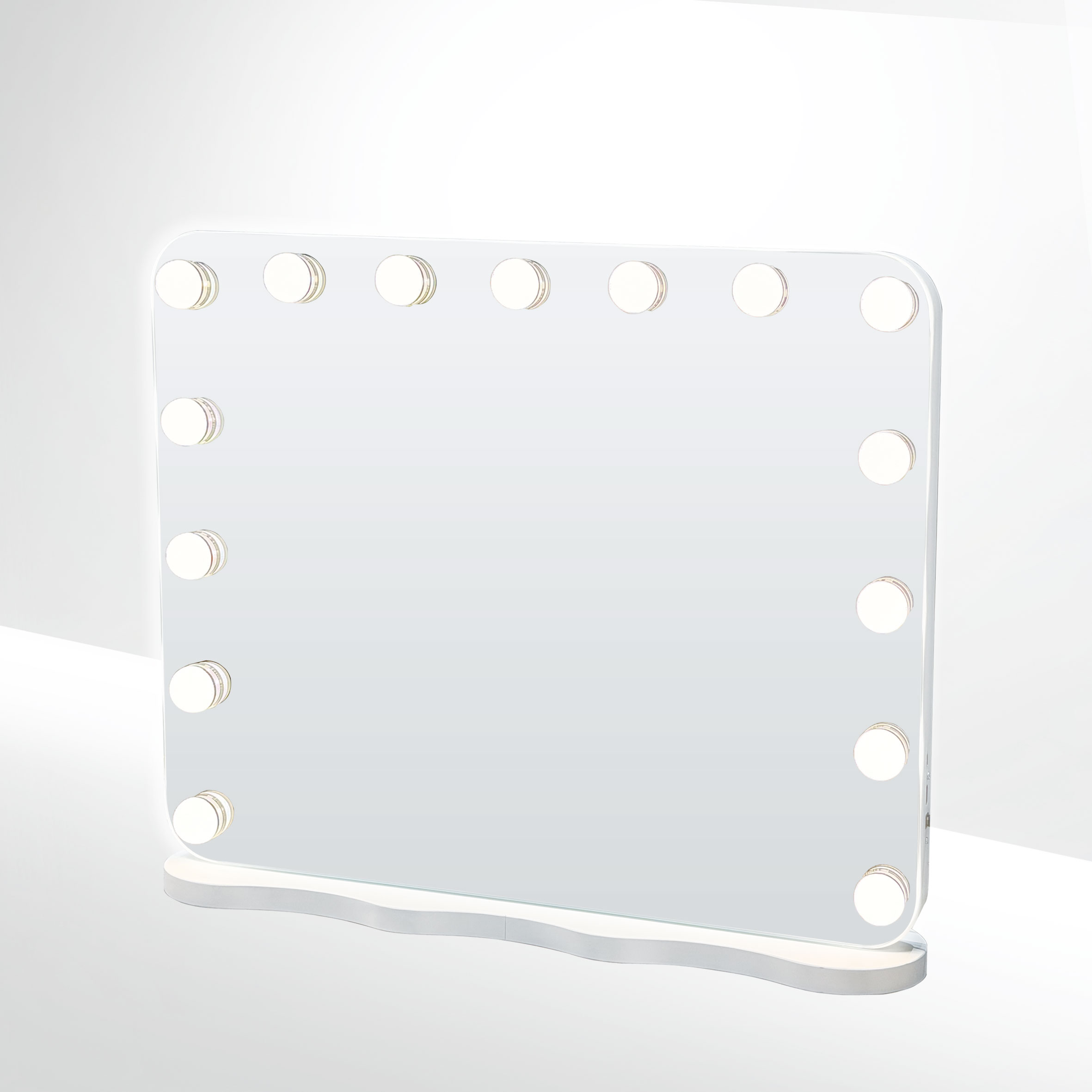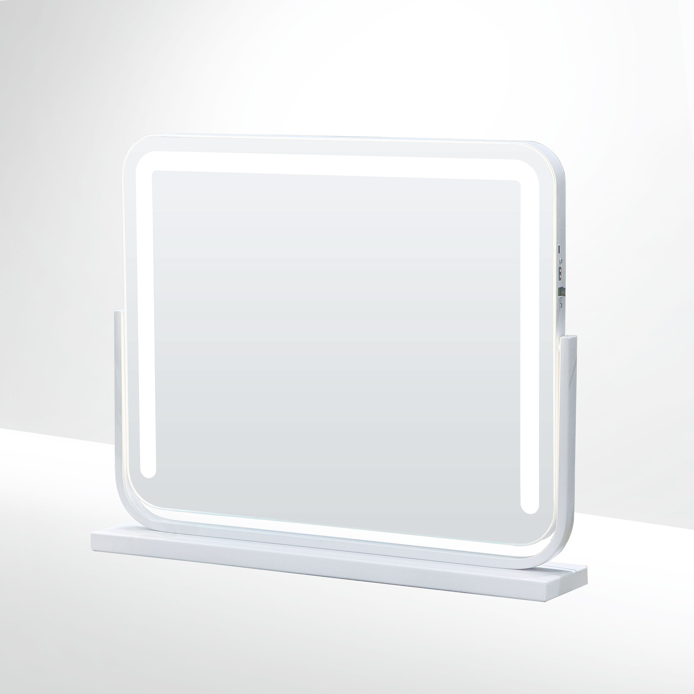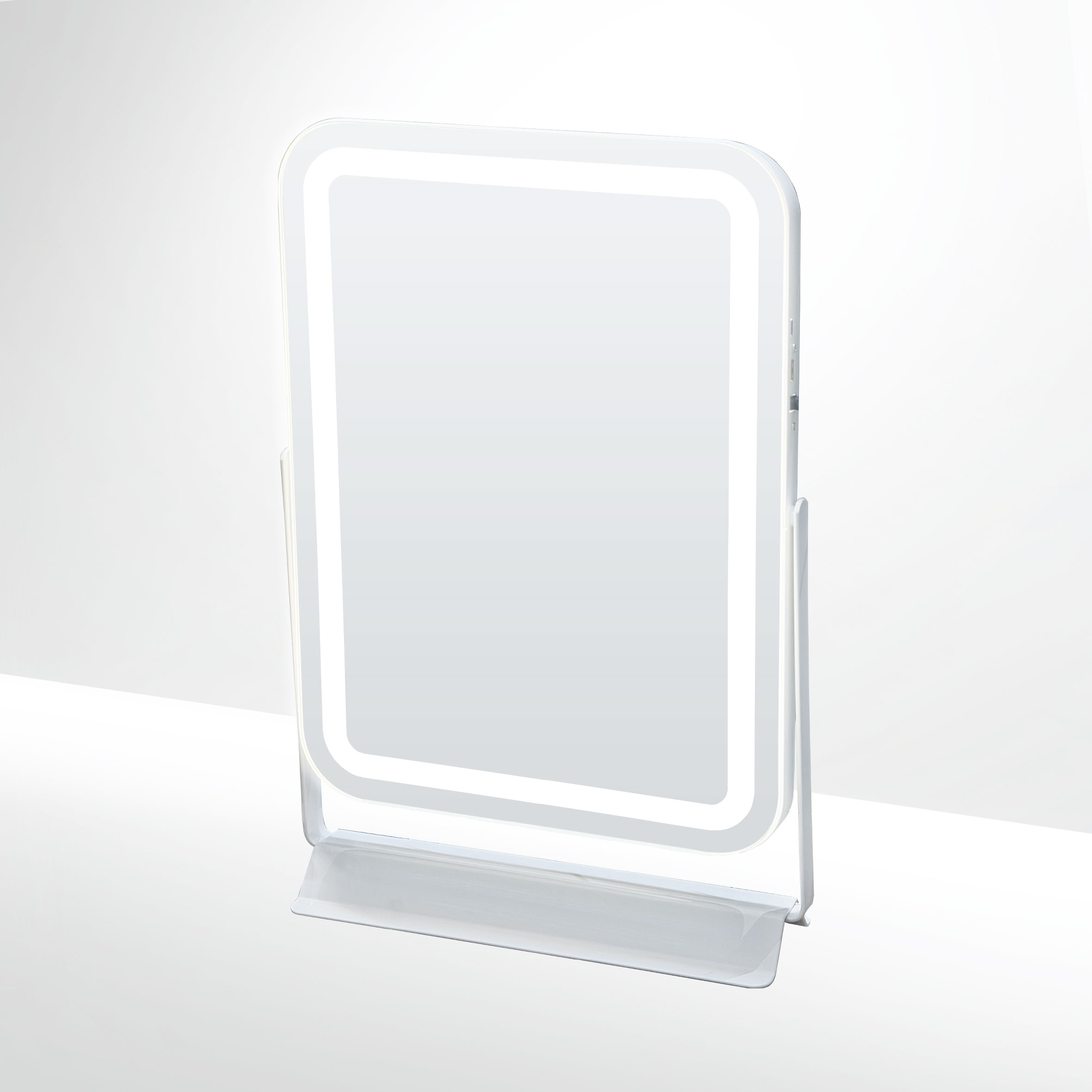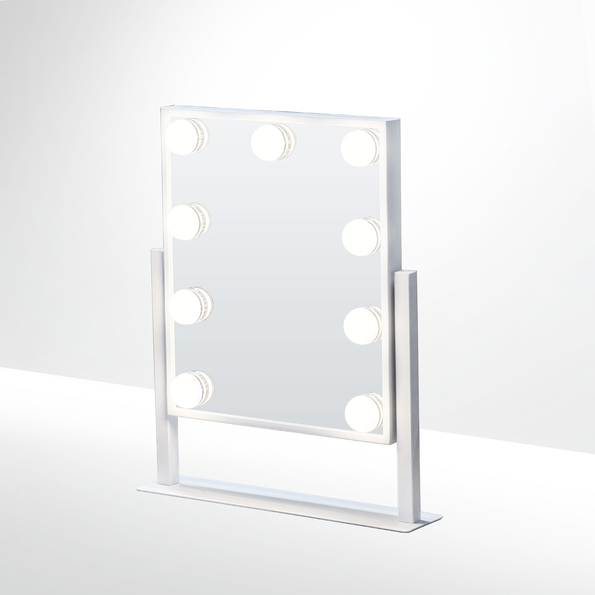 This tabletop mirror collection is defined by soft backlighting and clean, minimal forms.